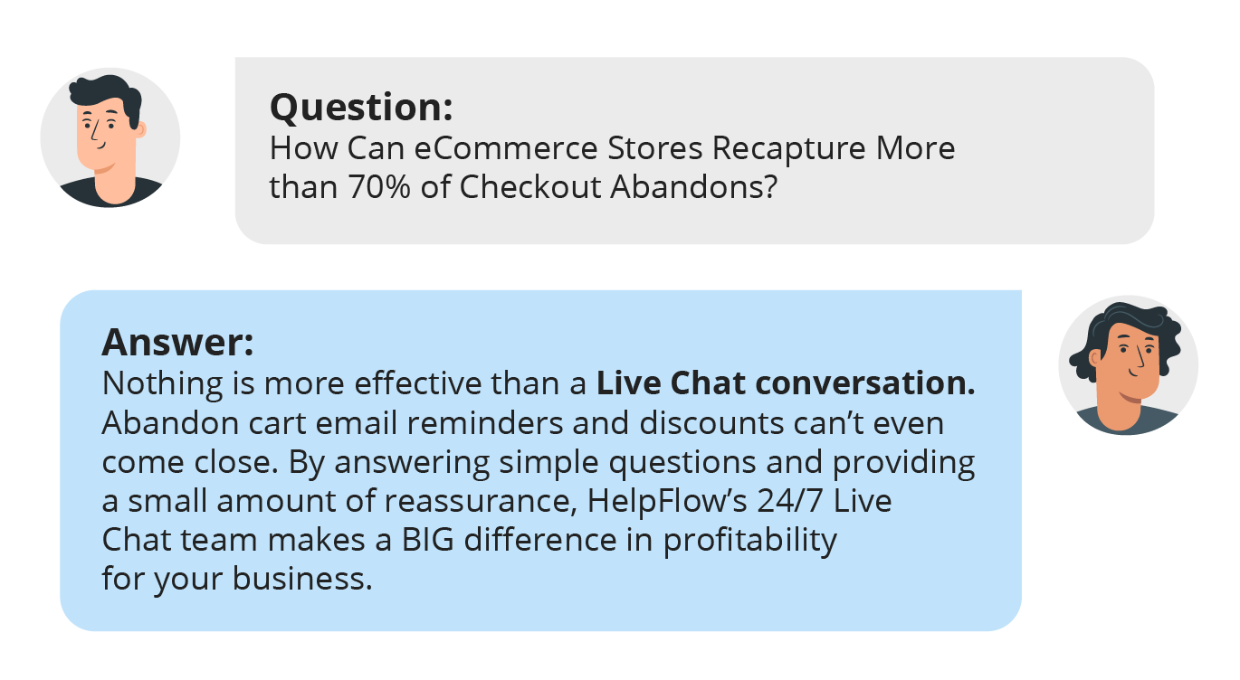 More than 100 eCommerce stores from all over the world are using HelpFlow’s Live Chat and Customer Service team to increase conversions and checkout recovery.